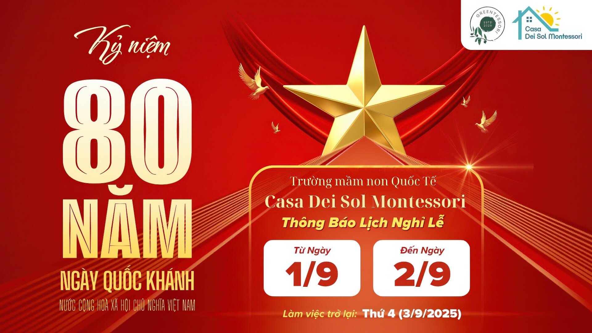 Nhà trường xin trân trọng thông báo đến Quý phụ huynh, quý đối tác cùng toàn thể Giáo viên, CBNV Casa Dei Sol về lịch nghỉ lễ Quốc khánh 2/9 năm 2025 như sau: